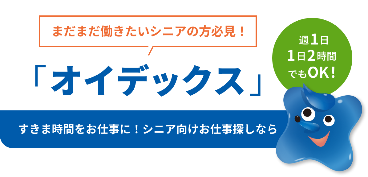 イデックスグループのお仕事紹介【オイデックス】は、無理なく、ご自身のペースで働きたいシニアの皆さんと、人材不足で困っているお店をつなぐサービスです。「週に1日から」や「1日2時間から」といった、ちょっと空い た時間を使って、これまでの経験を活かして働くことができる新しいかたちの「お仕事紹介サービス」です。ぜひイデックスグループのお店で働いてみませんか?