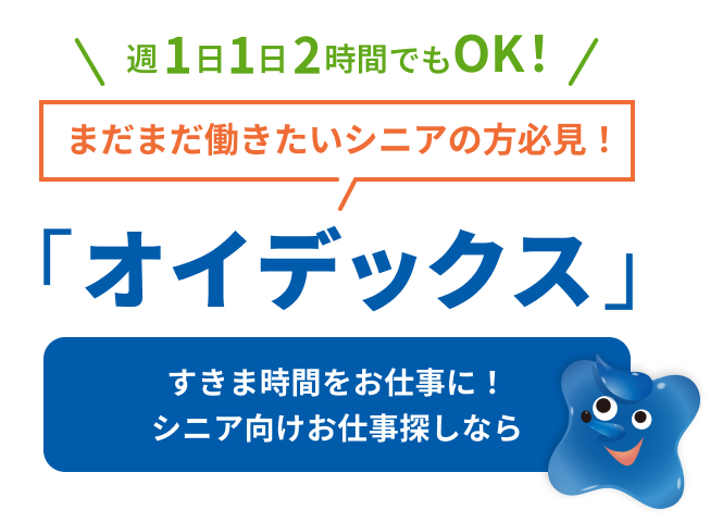 イデックスグループのお仕事紹介【オイデックス】は、無理なく、ご自身のペースで働きたいシニアの皆さんと、人材不足で困っているお店をつなぐサービスです。「週に1日から」や「1日2時間から」といった、ちょっと空い た時間を使って、これまでの経験を活かして働くことができる新しいかたちの「お仕事紹介サービス」です。ぜひイデックスグループのお店で働いてみませんか?